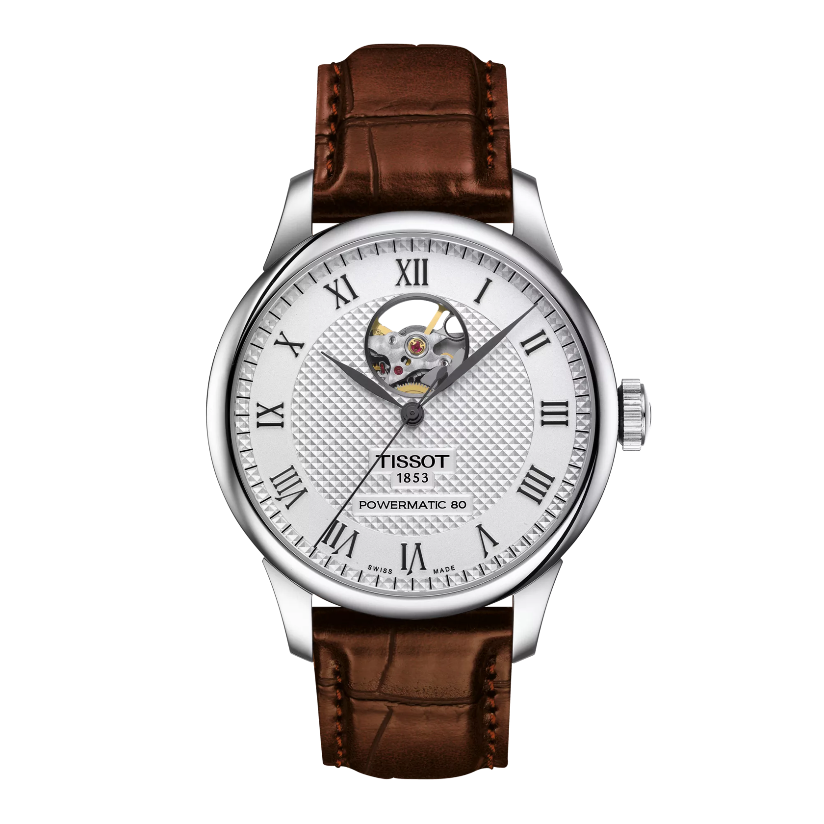 39mm stainless steel case, automatic Powermatic 80 movement, silver open heart dial, brown leather strap.