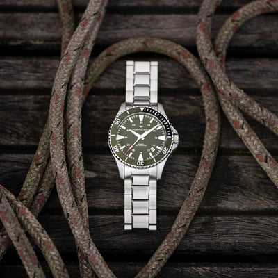 40mm stainless steel case, automatic movement, green dial, stainless steel bracelet.
