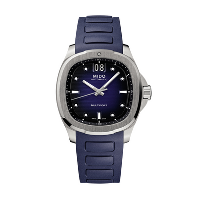 A brilliant flashback! Born from MIDO's extraordinary heritage, the TV-shaped case returns to centre stage for the Multifort TV Big Date, as intense as it is precise, thanks to its formidable mechanical movement. The modern and dynamic design of this Swiss watch is highlighted by a striking dial and, along with its distinctive function: the BIG DATE at 12 o'clock. Its formidable latest-generation automatic movement, Caliber 80, is equipped with a high-tech balance spring in Nivachron™, which offers outstanding resistance to shocks and magnetic fields.