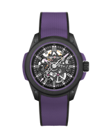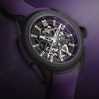 42mm black Norteq case, automatic movement, skeleton dial with purple accents, purple rubber strap.